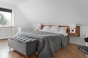 Sovrum med plats för dubbelsäng, klinkergolv och fast monterad stämningsfull belysning.