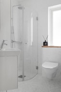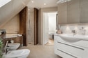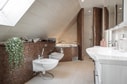 Påkostat, helkaklat, badrum med inmurat bubbelbadkar och duschplats, mosaik och kakelklädda väggar. Väggmonterad bidé samt wc-stol, tvättställ med kommod samt handdukstork. Infällda spotts i taket.