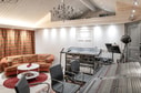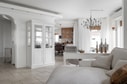 Vardagsrum: Ett ståtligt vardagsrum med klinkergolv och avancerad ljussättning rymmer plats för stor soffgrupp och en särskild loungedel i gränslandet mellan kök och vardagsrum. Stora fönsterpartier mot väster gör att ljuset flödar in.
