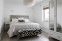 Delbart sovrum med vitmålade väggar och parkettgolv