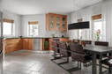Stort och socialt kök med inredning från exklusiva Scavolini Kök, inredning i körsbär och bänkskivor av massiv granitsten. Stänkskydd av ljust kakel ovan köksbänk. Köket är komplett utrustat med fullstor kyl och frys (LG 2024), diskmaskin (Smeg), inbyggnadsugn och micro samt spisfläkt. Matplatsen i köket har öppen planlösning mot vardagsrummet. Ett stort matbord för stora sällskap bjuder in till långa middagar. På golvet ligger klinkergolv och från köket finns utgång till altan under tak med klinkergolv och västerläge.