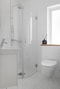 WC/Dusch med mosaikklädda väggar och mosaik på golvet. WC-stol, tvättställ med kommod samt duschplats med vikbara duschdörrar. Infällda spotts i taket och golvvärme.