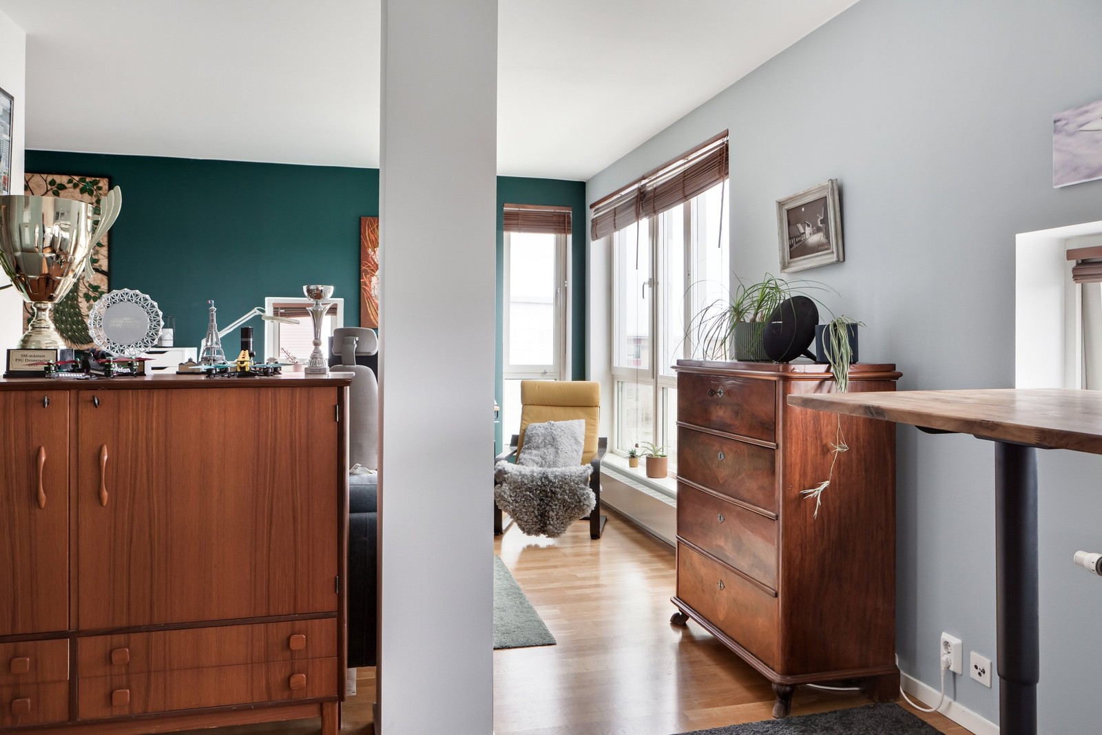 Sovdel: Naturligt avgränsad sovdel med plats för större säng. Här finns även goda förvaringsmöjligheter i flera garderober, vilket gör bostaden både praktisk och lättmöblerad.