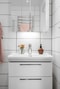 Helkaklat badrum med vita stora liggande kakelplattor, samt grått klinker på golv. Badrummet är utrustat med infällda spotlights, golvvärme, handdukstork, badrumsskåp, handfat med kommod samt dusch.