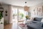 Vardagsrummet är en härlig samlingsplats med stora fönsterpartier som vetter mot den insynsskyddade trädgården. Parkettgolv och väggar målade i grå/beige kulör.