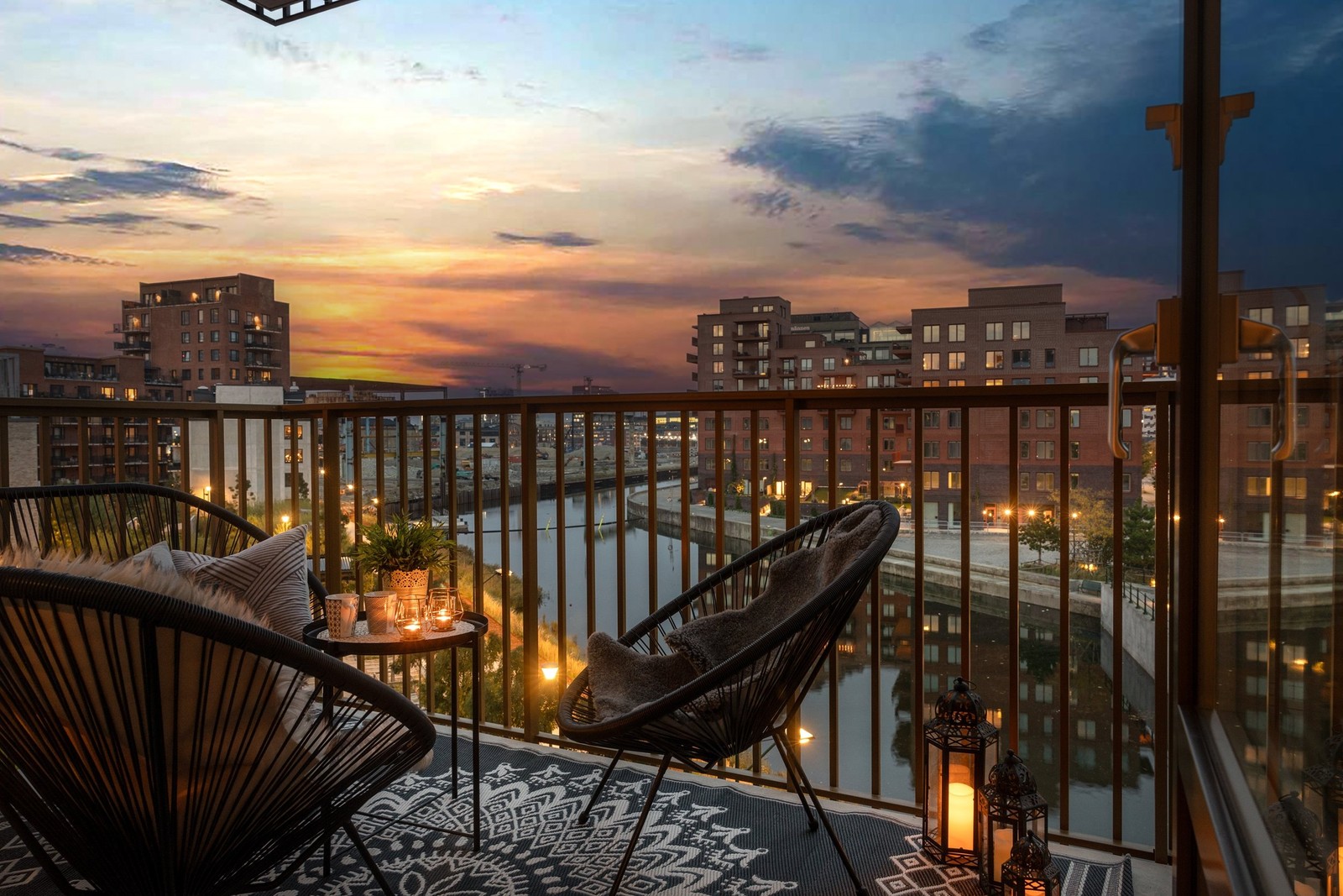 Denna magnifika bostad är en sällsynt pärla som lockar med otroliga utsikter åt två väderstreck; från det gemensamma vardagsrummet och köket når du balkongen i österläge där du avnjuter soluppgångar över Malmö City och slottet.