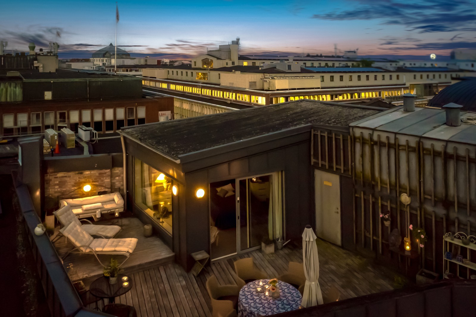 På extraordinär adress allra högst upp mitt i Malmös innersta kärna med fri utsikt över hustak och folkliv sträcker sig den moderna lägenheten på generösa 147 kvadratmeter. Terrassen som omfamnar hela gaveln uppnår en generös yta på cirka 25 kvadratmeter som ger härligt utrymme för olika avdelningar. Rakt nedanför porten erbjuder Lilla Kafferosteriet utsökt kaffe och fika. Butiker, stora som små, ligger som karameller på rad. Det oerhört centrala läget till trots är det rofyllt och tyst i lägenheten. Det vackra huset med tegelfasad och putsdekor uppfördes 1897 men genomgick en total ombyggnation 2006 vilket gav lägenheten på översta våningen ett rakt igenom modernt stilspråk. Materialvalen är enhetliga, formrena och påkostade. Volymen och ljuset står hela tiden i centrum, genom öppna rum och mängder av fönsterrader.