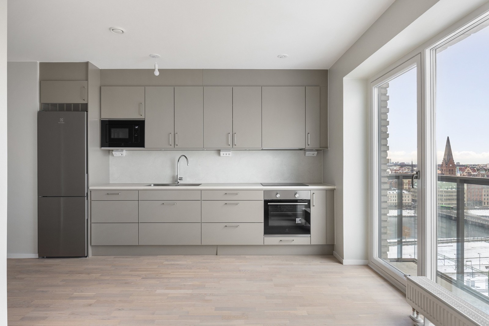Denna nyproducerade tvårumslägenhet erbjuder en öppen planlösning mellan kök och vardagsrum med stilren inredning och kvalitativa vitvaror. En fransk balkong i anslutning till kök och vardagsrum ger fint ljusinsläpp och en luftig känsla.