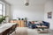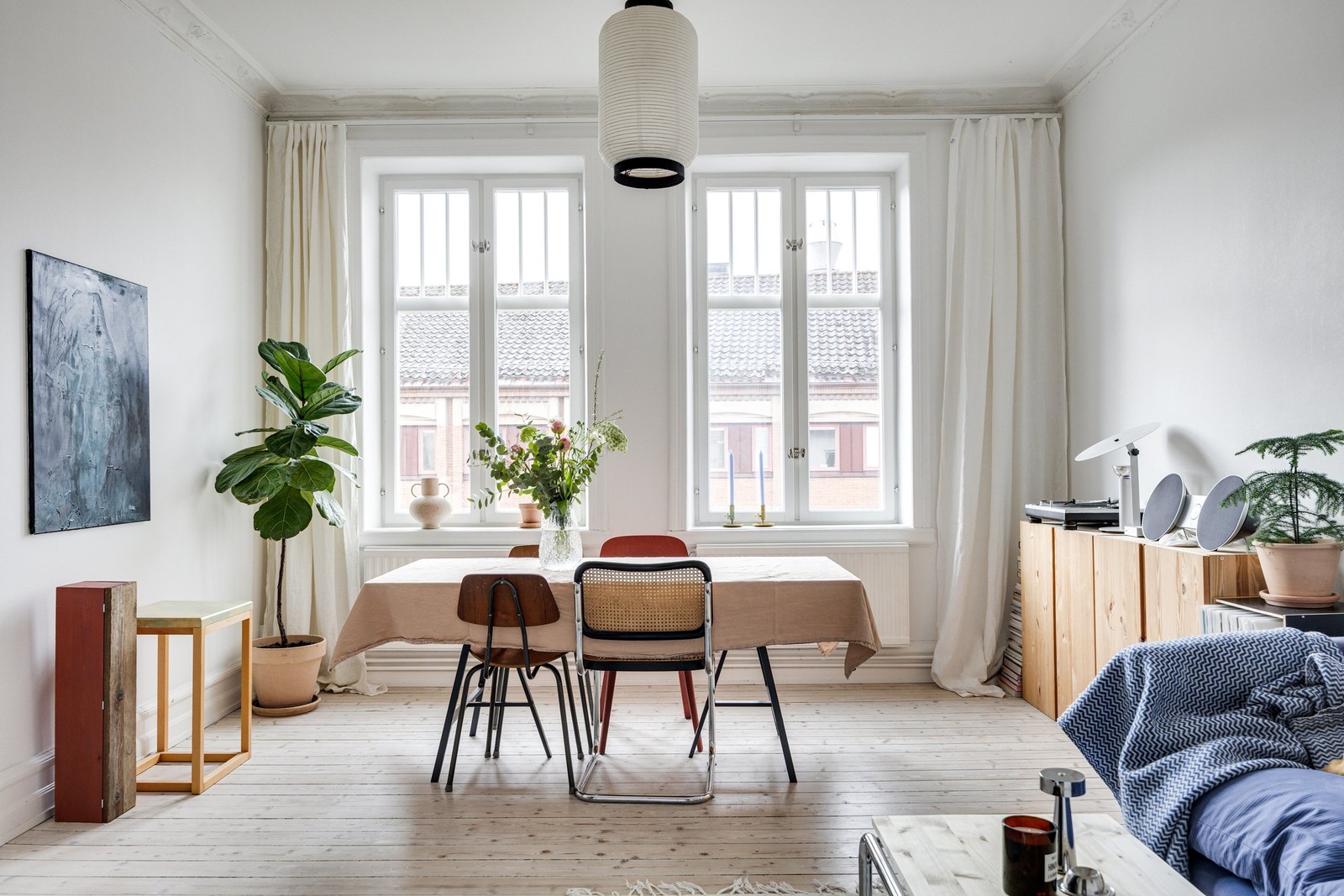 Vardagsrum - Vardagsrummet är bostadens givna samlingspunkt där vi slås av ljuset och takhöjden. Plats för soffa och matsalsbord. Rummet pryds av en kakelugn och vackra stuckaturer.