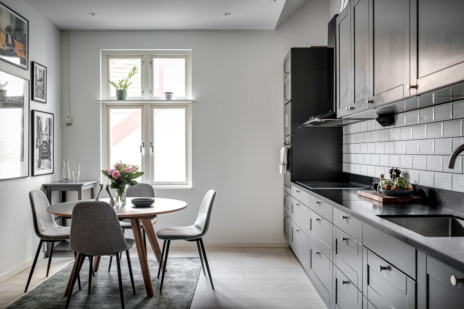 Vidare in i bostaden finner du det smakfulla köket som renoverades i sin helhet 2018. Köket består av stilren köksinredning från HTH med mörkgrå köksluckor och fullutrustad maskinpark. Vitt kakel med mörka fogar klär väggen ovanför bänkskivan i svart granit. Köket är väl tilltaget med bra arbetsytor och goda förvaringsutrymmen. Köksutrustningen består av induktionshäll (Siemens -18), varmluftsugn (Siemens -18), inbyggnadsmicro (Siemens -18), integrerad diskmaskin (Siemens -18), kyl och frys i fullhöjd (Samsung -18) samt köksfläkt (Franke -18). Matplatsen i köket rymmer med lätthet sex personer. Väggarna är vitmålade.