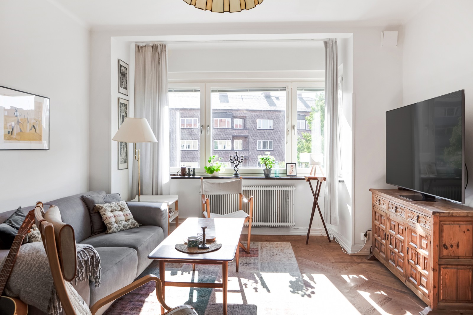 Fiskbensparkett och vita väggar. Stort och ljust med plats för soffhörna i semiöppen planlösning med köket som skapar en fin rymd. Praktisk och avskild sovalkov som rymmer en dubbelsäng. Här finns även en inbyggd klädkammare.