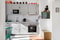 Brädgolv och vita väggar. Köksinredning utgörs av grå skåpsluckor, marmorinspirerad arbetsyta och stänkskydd i vitt kakel. Maskinell utrustning består av induktionshäll, spisfläkt, diskmaskin, ugn och mikrovågsugn. Matplats för 2 personer.