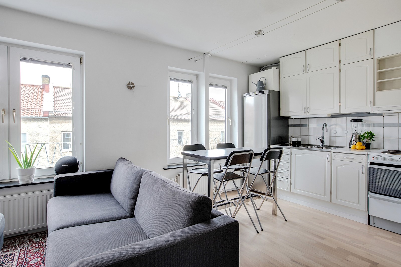 Här möts vi av en trevlig hall med plats för bra förvaring. Vidare kommer bostadens rum där öppen planlösning mellan kök och vardagsrum ger ett öppet och trevligt intryck. Stora fönster ger ett fantastiskt ljusinsläpp på fjärde våningen, högst upp och inga grannar ovanför!