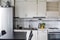Köket går i tidlöst vitt med skåp ända upp till taket för optimal förvaring. Utrustat med spis/ugn, kyl/frys och köksfläkt med små hyllor framför. Diskho med tillhörande diskbänk samt en yta i vitt. Ovanför bänken sitter kakel i vitt.