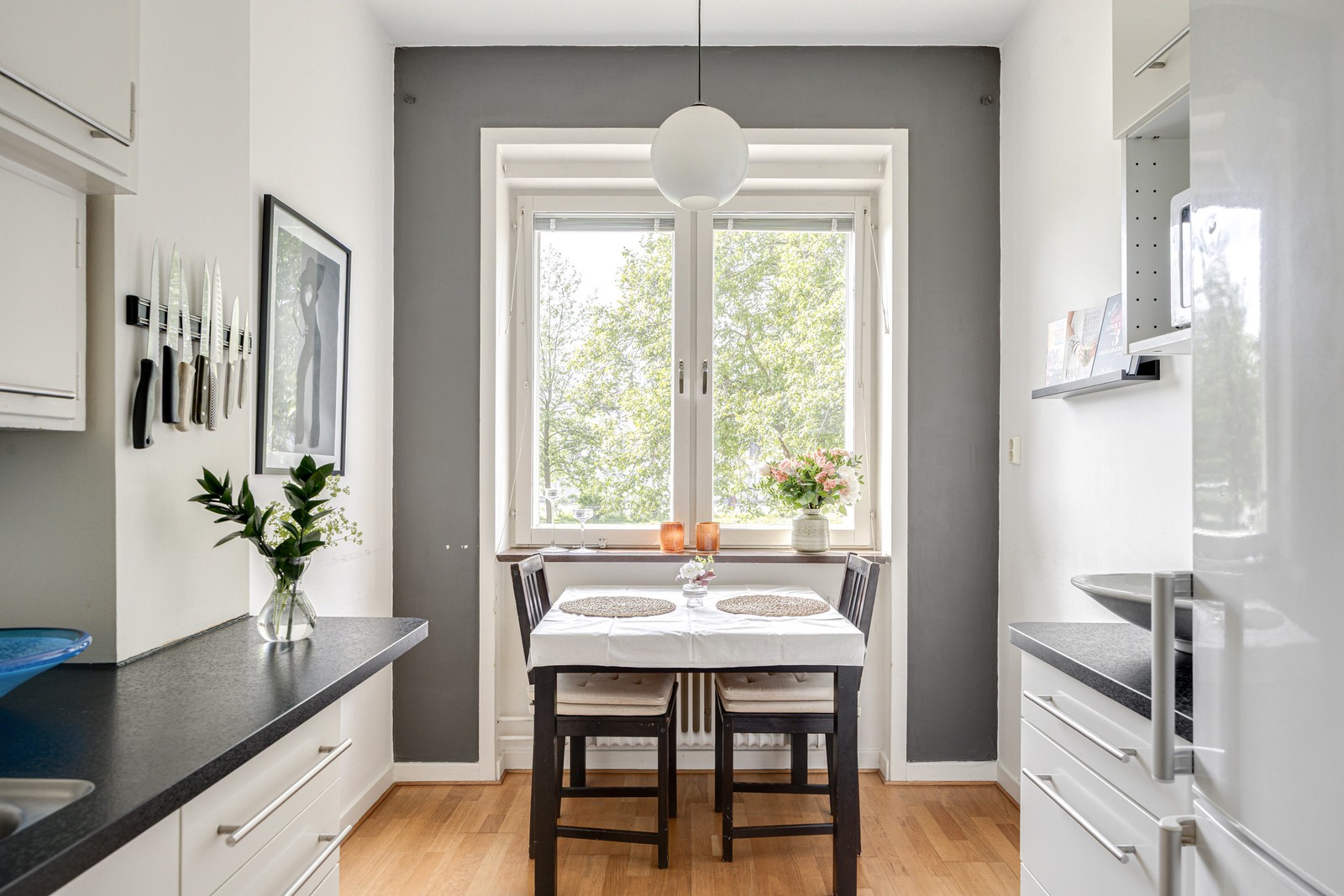 Kök - Till vänster om entrén ligger bostadens trivsamma kök med gott om förvaring samt ett separat skafferi. Köket renoverades 2014 och är inrett med vita träluckor, kromade beslag och vitt kakel ovan den svarta bänkskivan från KVIK. Det vackra parkettgolvet förstärker bostadens 30-talskaraktär och harmonierar fint med de vita väggarna och den grå fondväggen. Den maskinella utrustningen består av spishäll och ugn (Electrolux 2014), diskmaskin (Bosch 2015) samt kyl/frys (Whirlpool 2014). Matplatsen vid fönstret rymmer med lätthet fyra personer och bjuder på en härlig utsikt mot grönska.