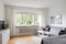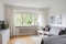 Vardagsrum/Sovrum - Rakt fram från entrén nås det rymliga vardagsrummet med generös takhöjd och stort fönsterparti. Tack vare läget en halv trappa upp är rummet insynsskyddat, samtidigt som fönstret vetter mot en grönskande gårdsmiljö som bidrar till en lugn och tyst atmosfär. Rummet är lättmöblerat och rymmer med enkelhet både soffgrupp och säng. Parkettgolv och vitmålade väggar skapar en ljus, harmonisk och luftig känsla.