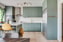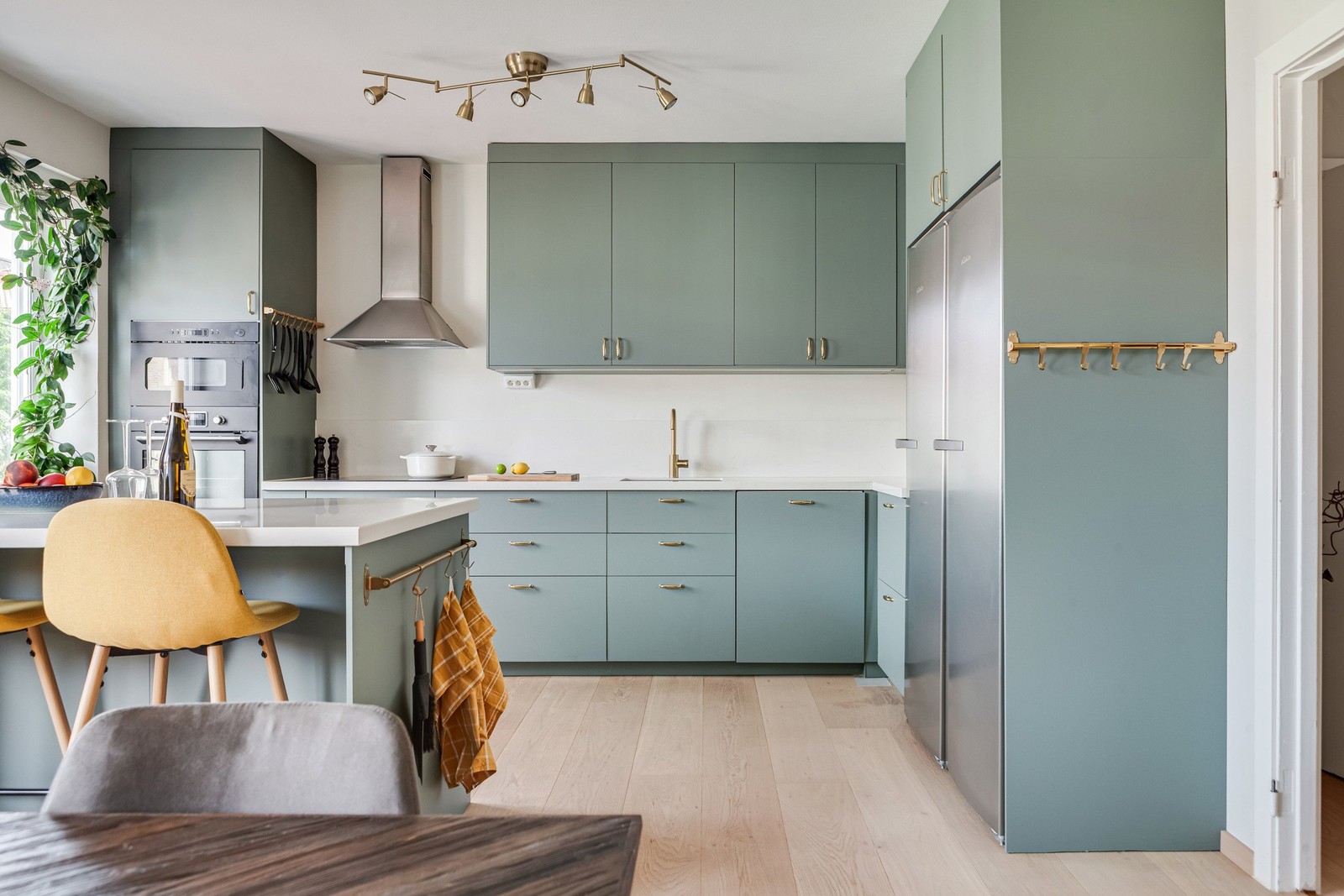 Köket från IKEA är en perfekt kombination av stil och funktion. Sandtonade väggar möter ekparkett och en mossgrön inredning, där bänkskiva och stänkskydd i kvartskomposit med vit marmorstruktur skapar en exklusiv känsla. Den välplanerade layouten bjuder på en generös köksö, rikligt med förvaring och arbetsytor som gör matlagningen till ett nöje. Fullt utrustat med induktionshäll, kolfilterfläkt, diskmaskin, varmluftsugn, mikro, kyl och frys, och med plats för ett stort matbord för upp till 8 personer. Det generösa ljusinsläppet gör att köket känns lika trevligt att vistas i en vardagskväll som under festliga middagar med vänner och familj.