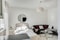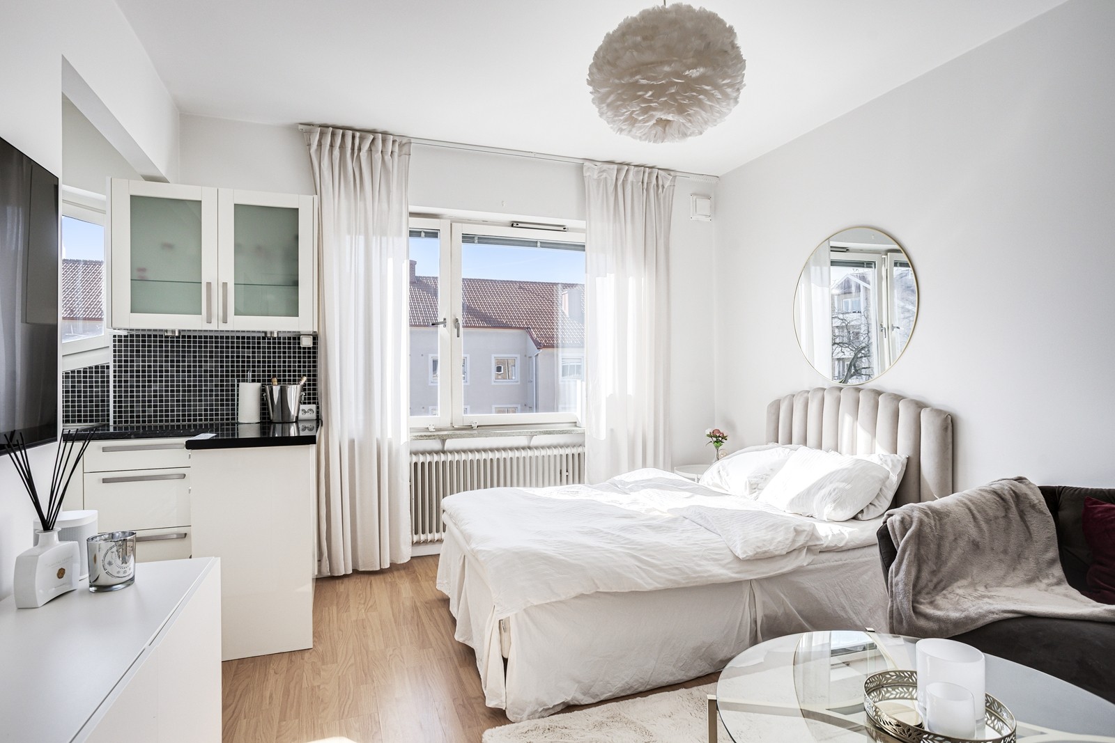 Lägenheten har ett genomgående ljust intryck med vita väggar och ett enhetligt laminatgolv. Den smarta planlösningen erbjuder gott om plats för både säng och soffa, vilket skapar en inbjudande och trivsam atmosfär.