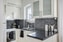 Det moderna köket går i stilrena färger med vita skåpluckor och en elegant svart mosaik ovanför den praktiska laminatbänkskivan. Ett charmigt fönster ovan vasken ger ett naturligt ljusinsläpp. Köket är utrustat med kyl, ugn, spishäll och spisfläkt – allt du behöver för att trivas!