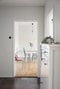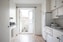 Via hallen når vi köket. Fint kök med originaldetaljer, vita köksluckor, grå bänkskiva och vitt kakel som stänkskydd.