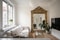 Rofyllt och välplanerat sovrum med plats för dubbelsäng och generös förvaring längs ena väggen. De bredspacklade väggarna i mjuka nyanser och de vackra originaldetaljerna – stuckatur, takrosett och höga golvlister – skapar en harmonisk helhet. Stort tvåluftsfönster släpper in ett behagligt ljus.
