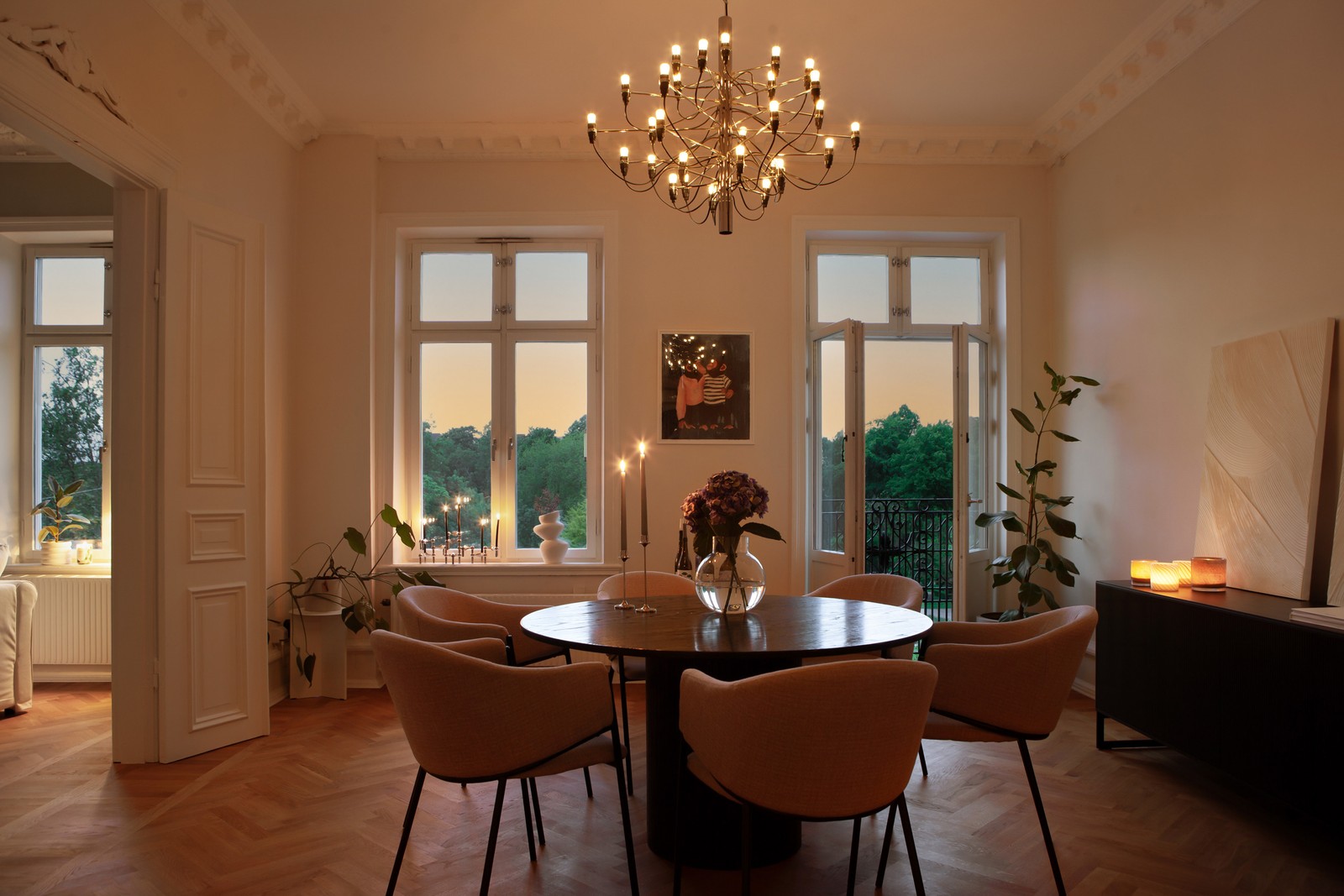 Stuckaturerna, som pryder lägenhetens tak, har nu fått nytt liv genom varsam renovering. De ger en känsla av tradition och elegans som kompletterar den moderna renoveringen på ett unikt sätt. Denna kombination av gammalt och nytt ger en unik charm som inte går att finna någon annanstans.
