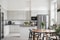 Öppen planlösning med en en takhöjd på c:a 3.2 meter. med stora fönsterpartier ut mot Davidhall. Vardagsrum och kök är på hela 39 kvm så det finns gott om plats för både soffgrupp och matrum. Här finns även en praktisk köksö för extra arbetsyta. Köksluckorna går i ljusgrått, vit kakel ovan den matchande bänkskivan.Utrustningen består av kyl, frys i rostfritt, inbyggnadsugn, mikrovågsugn, induktionshäll, fläktkåpa, samt diskmaskin. Väggarna går i vitt med matchande matt vitlackerad parkett.