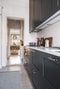 En charmig serveringsgång med bevarade skåp från byggåret leder vidare in till det renoverade köket med brädgolv och bredspacklade väggar. Känslan är solid och påkostad med grafitgrå köksinredning, vit bänkskiva samt maskinell utrustning som består av gashäll från Smeg, ugn från Gaggeneau, kyl, frys och diskmaskin. Via köket nås den härliga balkongen balkongen som erbjuder en rymlig uteplats med härlig kvällssol och utsikt över den välskötta innergården. I tidstypiskt manér finns även en dörr som leder ut till kökstrappan och vidare ner till gården.