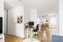 Kök i öppen anslutning till vardagsrummet. Vitt kök med goda arbetsytor och plats för matbord.