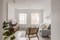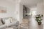 Vardagsrum i öppen planlösning mot kök med plats för soffa och matplats.
