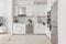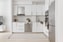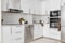 Vidare in i bostaden ligger köket som stoltserar med smakfull köksinredning som utgörs av vita, högblanka köksluckor och vitt kakel ovanför bänkskivan i marmor. Köksutrustningen består av kombinerad kyl/frys (Bosch), induktionshäll (Whirlpool), köksfläkt, inbyggnadsugn med varmluftsfunktion (Bosch), inbyggnadsmicro (Bosch) och diskmaskin (Bosch). I taket finns dimbara spotlights.