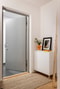 Bostaden präglas av ljusa färger, genomgående ekparkett och ett harmoniskt flöde mellan rummen – en stilren helhet där materialvalen skapar både elegans och trivsel.