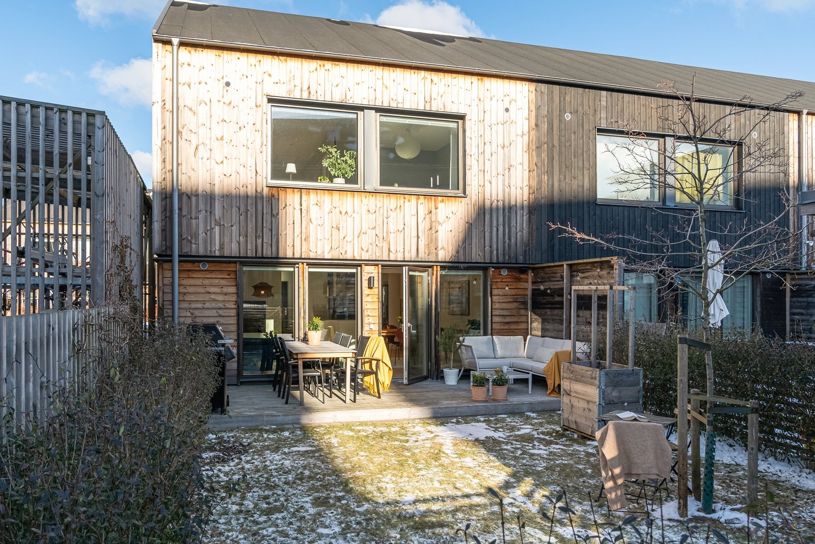 Stilrent radhus om 122 kvm med ljusa ytor, tre sovrum och två badrum. Mysig söderträdgård med trädäck, gräsmatta och grön häck.