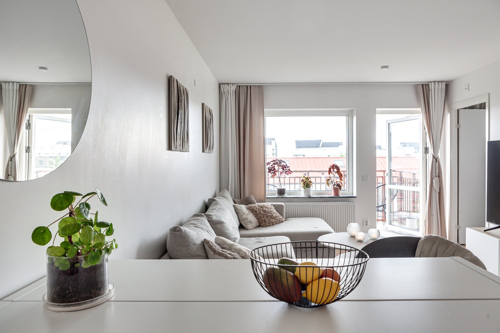 Öppen planlösning mellan kök och vardagsrum. Köket är fullt utrustat med vitt skåpinredning i matchande stänkskydd med full uppsättning av vitvaror såsom spis med induktionshäll och ugn och mikro i arbetshöjd, fläkt, integrerad diskmaskin och kombinerad kyl/frys. Här erbjuds mycket goda arbetsytor och förvaring vilket gör detta till drömplatsen för alla som gillar matlagning! Med klassiska kulörval och generösa ytor kombineras en modern och stilren känsla med praktisk komfort. Vardagsrummet har vi gott om plats med en soffgrupp, soffbord samt tv-möblemang. Vardagsrummet bjuder på ett härligt ljusinsläpp med hjälp av det stora fönsterpartiet ut mot balkongen, som skapar en härlig och ljus atmosfär i lägenheten. På golvet vilar samma enhetliga parkett och väggarna målade i vitt.