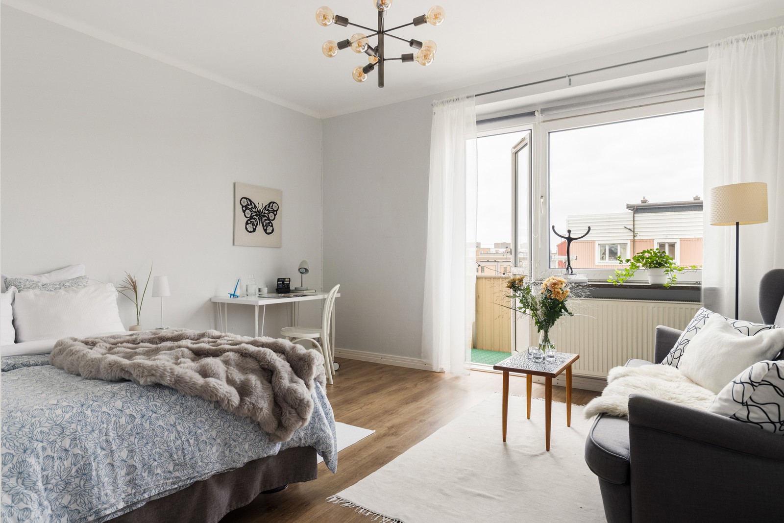 Laminat på golv och målade väggar. Ger plats för soffa och säng. Utgång till balkong.