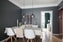 Laminatgolv och målade blå väggar. Ger plats för båda soffgruppen och matsalsmöblemang.