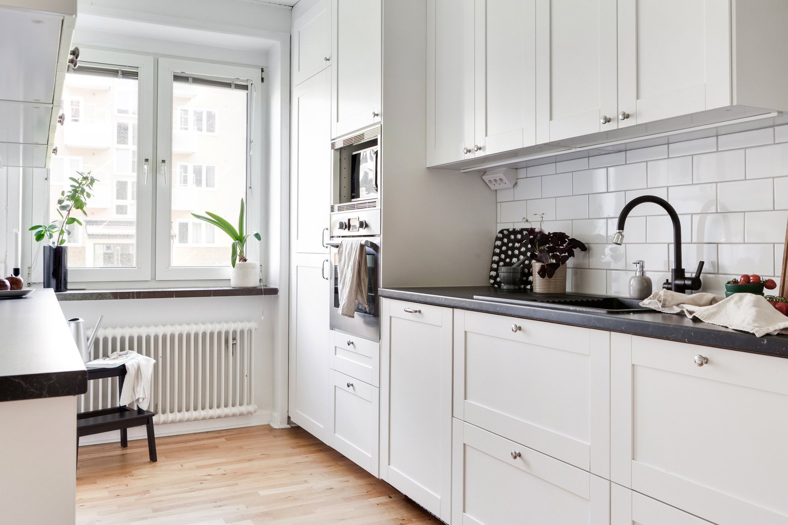 Köket totalrenoverades 2021. Vita luckor kombineras med laminatbänkskiva och kakel ovan som stänkskydd. Vita väggar och parkett på golv. Utrustat med induktionshäll, varmluftsugn, mikro, kyl/frys, fläkt samt diskmaskin. Samtliga vitvaror är från Ikea 2021 förutom mikron som är från Samsung 2019 och frysen 2026.