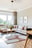 Genom hallen och till höger nås bostadens vardagsrum. Fiskbensparketten ligger även här på golv och väggarna är gråmålade.