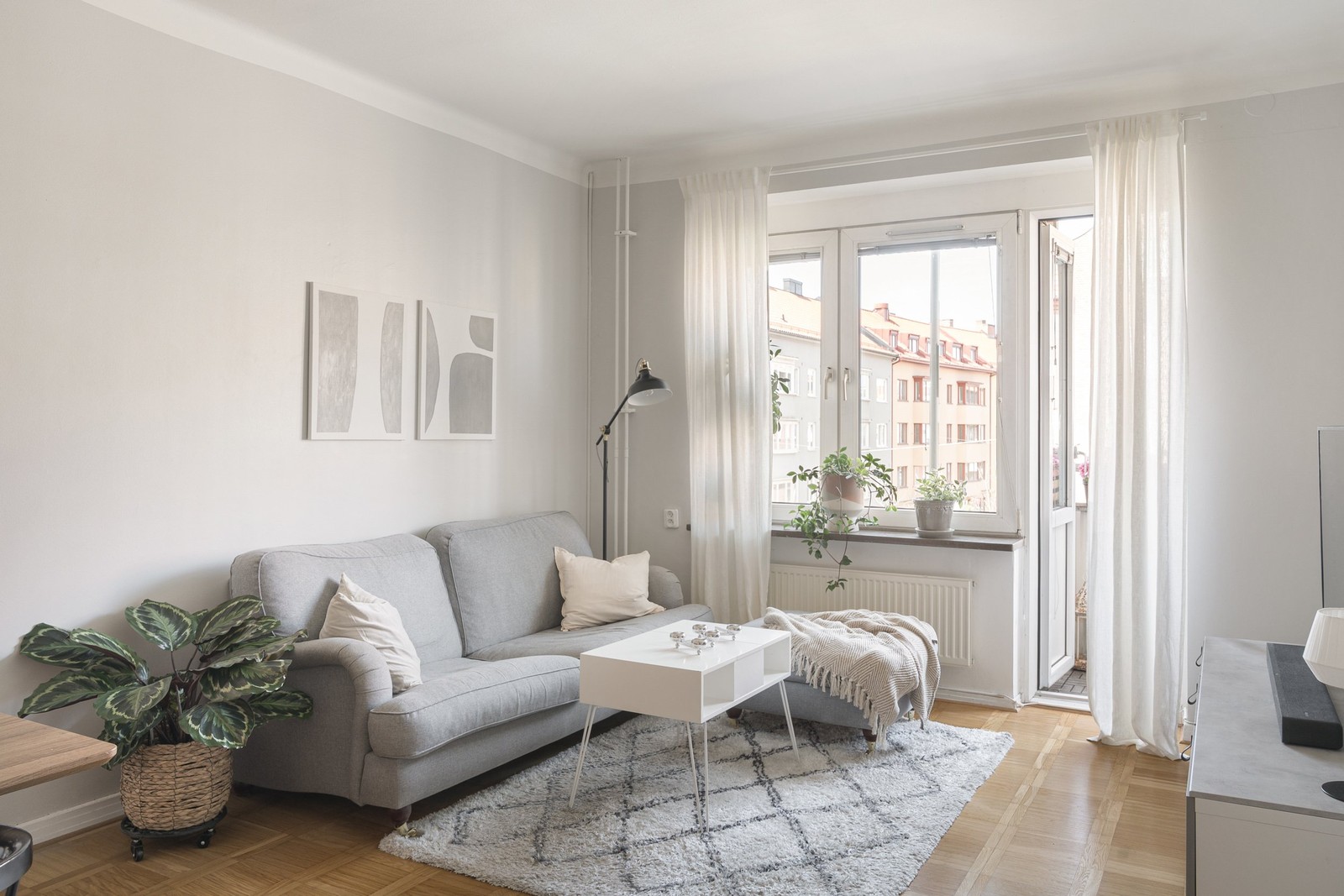 Här får du det bästa av två världar: vackra tidstypiska inslag som generös takhöjd, parkettgolv och dekorativa lamprosetter kombineras med ett stilrent, renoverat kök och badrum samt släta bredspacklade väggar och tak. Planlösningen är genomtänkt och bjuder på ett oerhört trevligt vardagsrum med plats för både soffgrupp och matplats, med utgång till balkongen i västerläge där du kan njuta av kvällssolen.