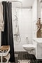 Modernt badrum med vita kaklade väggar och grått klinkergolv. Badrummet är försett med dusch, vägghängd WC, spegelskåp och vask.