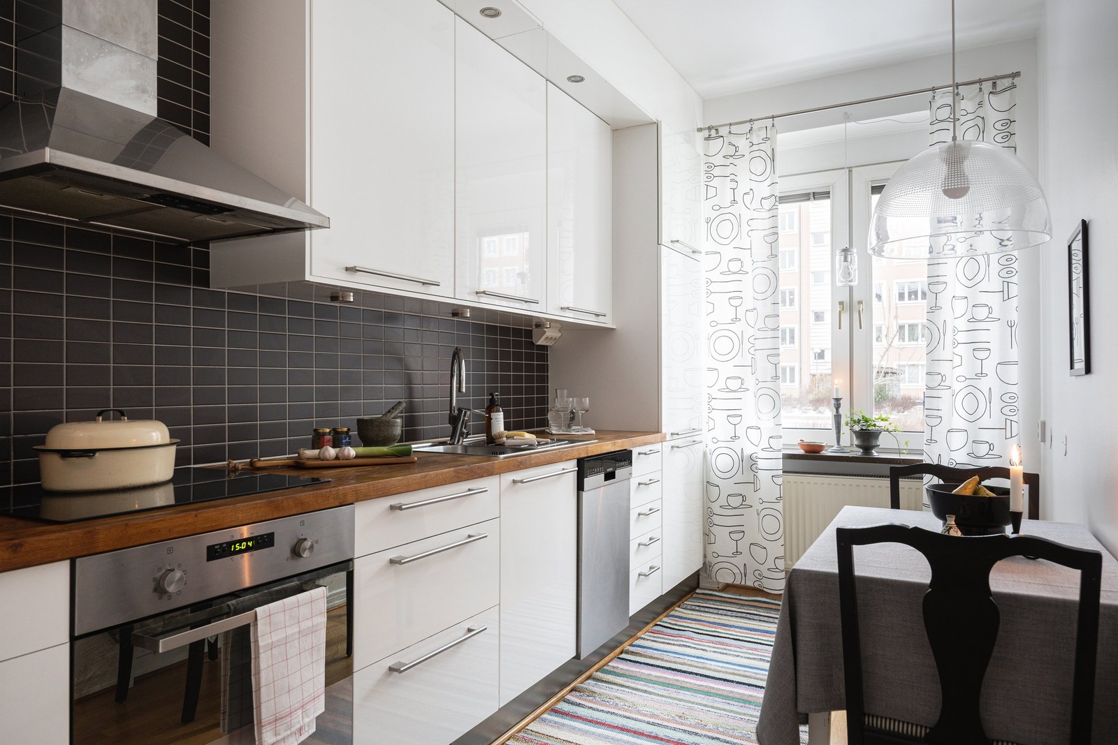 Från hallen till höger finner vi bostadens kök som bjuder på smakfull köksinredning bestående av köksluckor i vitt, bänkskiva i trä och brunt kakel ovan som stänkskydd. Det bjuds på goda förvaringsmöjligheter i över- och underskåp. Köket är vidare utrustat med spishäll, ugn, kyl/frys, fläkt samt diskmaskin (Siemens 2024). Köket är stort nog att rymma matplats. Köket vetter ut mot föreningens innergård.