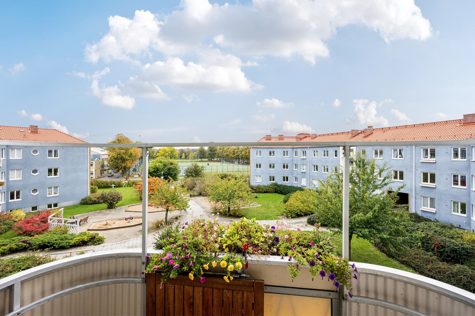 Högst upp i huset på våning 3/3 ligger denna genomgående tvåa med fint ljusinsläpp och härlig utsikt mot innergården. Här finns ett stort vardagsrum med utgång till den härliga balkongen med fri utsikt där du kan njuta av solen stor del av dagen. I vardagsrummet finns gott om utrymme för både matsalsbord och soffa. I sovrummet finns plats för såväl dubbelsäng som garderober. Hallen har gott om förvaring i garderober från Kvik och här finns också en säkerhetsdörr. Köket kommer även det från Kvik och har gott om förvaring och bänkyta samt plats för ett större matbord.