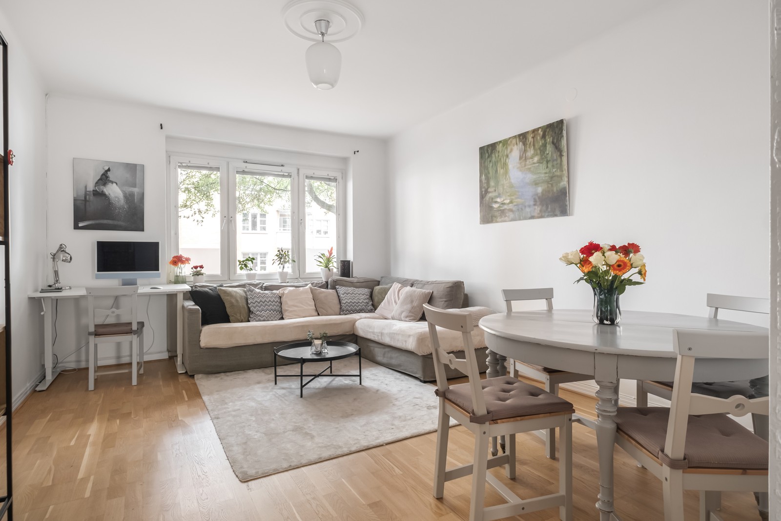 Lägenheten är genomgående och bjuder på ett rofyllt sovrum som vetter mot föreningens lugna och grönskande innergård, badrum och kök är renoverat och samtliga golv är nyligen nyslipade.