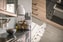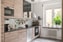 Stora grå klinkerplattor på golv och vita väggar. Köket är inrett med trämönstrade köksluckor, grå laminatbänkskiva och mosaik som stänkskydd. Köket är utrustat med diskmaskin, ugn, häll, mikro, samt kombinerad kyl och frys.