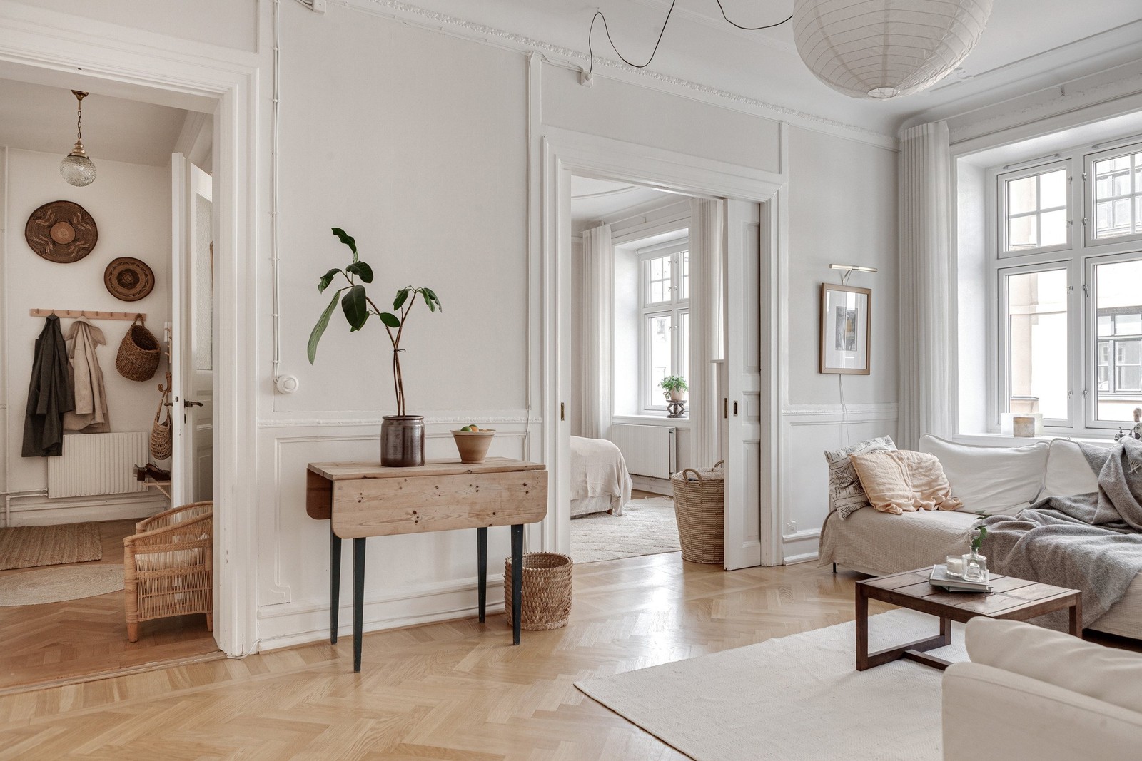 Välkommen in i denna pampiga bostad med en slående takhöjd och mängder av fina attribut. Precis innanför entrén erbjuds plats för avhängning av ytterkläder. På golvet vilar fiskbensparkett.