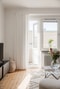 Ljust och trivsamt allrum med generöst ljusinsläpp och utgång till balkong i sydvästläge. Rummet erbjuder en luftig och lättmöblerad yta med plats för både säng och soffgrupp. Ljusa färger i kombination med det fina trägolvet ger en harmonisk helhet.
