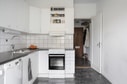 Det stora köket har laminat på golvet och vita väggar som ger en ljus atmosfär. De äldre vita köksluckorna kombineras med en laminatbänkskiva och vitt kakel ovanför, vilket ger en klassisk och funktionell känsla. Köket är fullt utrustat med kyl/frys, diskmaskin, spis/ugn och fläkt. Observera att tvättmaskinen inte ingår i överlåtelsen.