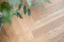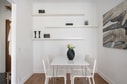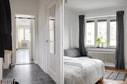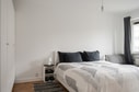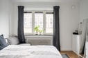 Sovrummet är en lugn och harmonisk plats med fiskbensparkett och vita väggar. Det stora fönsterpartiet släpper in rikligt med naturligt ljus, och det finns gott om plats för en dubbelsäng samt bra förvaringsmöjligheter längs ena väggen.