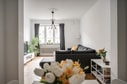 Vardagsrummet är rymligt och inbjudande med en separat del i halvan som passar perfekt för ett middagsbord. Den vackra fiskbensparketten och lamprosetten ger rummet en elegant karaktär.