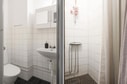 Lägenheten har en välkomnande hall med vita väggar och laminat på golvet, vilket skapar en ljus och lättskött entré. Till höger i hallen finner du duschrummet, som är utrustat med mosaik på golvet och vitkaklade väggar för en fräsch och stilren känsla. Intill ligger WC:n med mörkt klinkergolv och halvkaklade väggar, komplett med handfat, WC och spegelskåp.